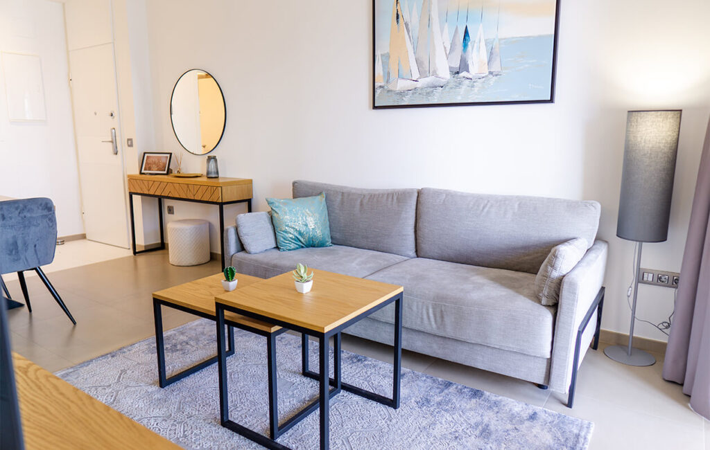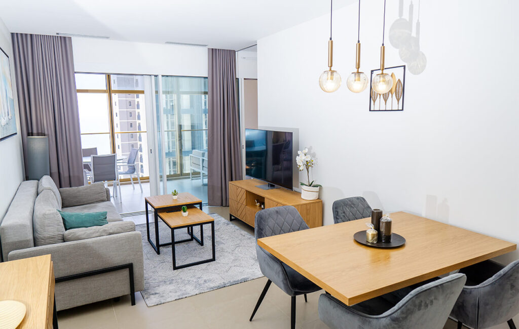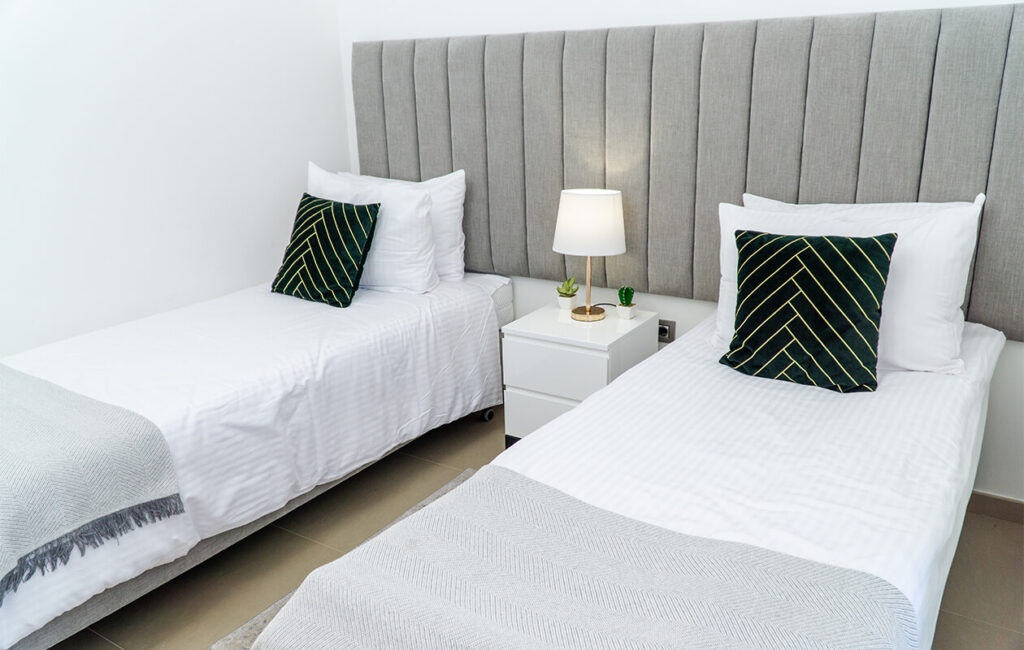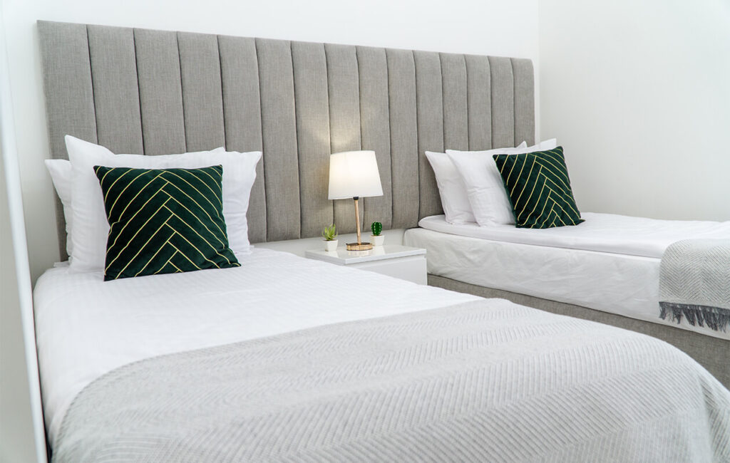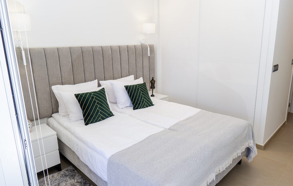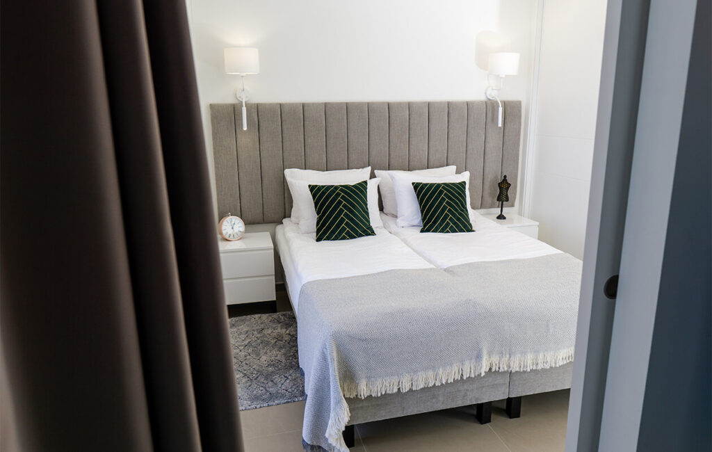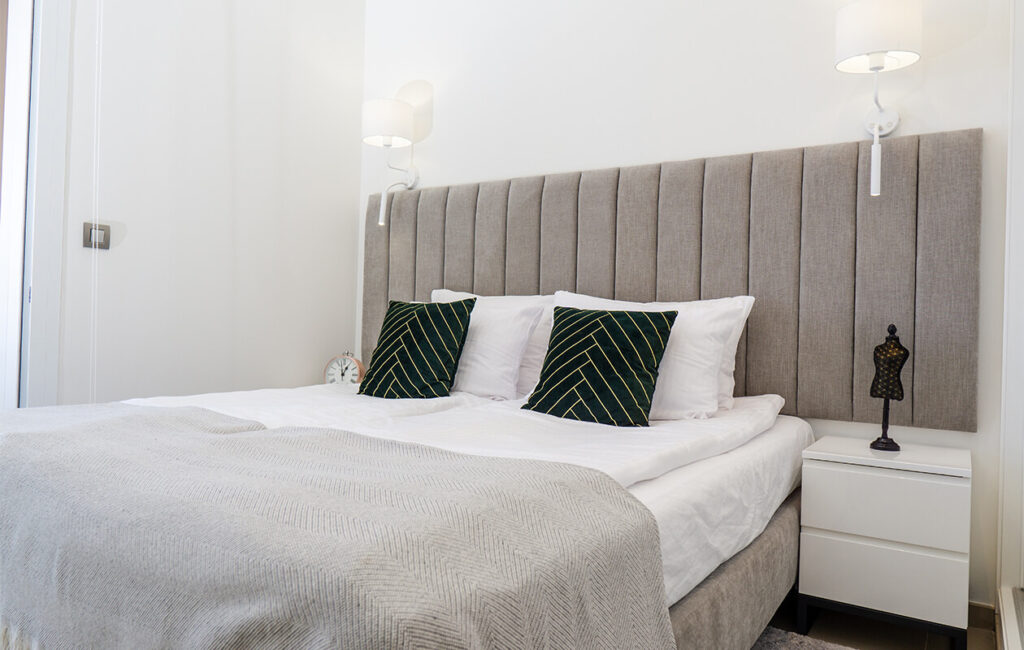 Elegancki apartament o wysokim standardzie, oferujący dwie przestronne sypialnie. Jedna sypialnia posiada duże, wygodne łóżko, idealne na relaks po dniu pełnym wrażeń. Druga posiada dwa pojedyncze łóżka. Nowoczesny salon, wyposażony w wygodny zestaw wypoczynkowy i telewizor, stanowi doskonałe miejsce na wieczorny odpoczynek lub spotkanie z bliskimi. W pełni wyposażona kuchnia, zawierająca najnowsze sprzęty, umożliwia przygotowanie własnych posiłków w komfortowych warunkach.