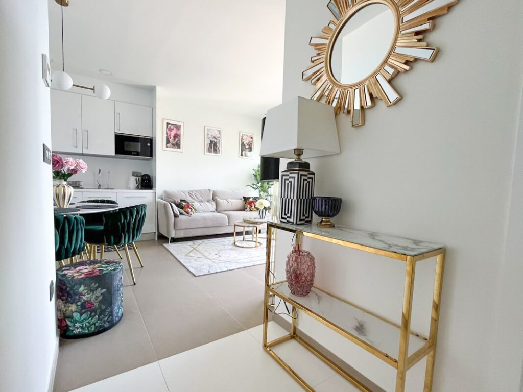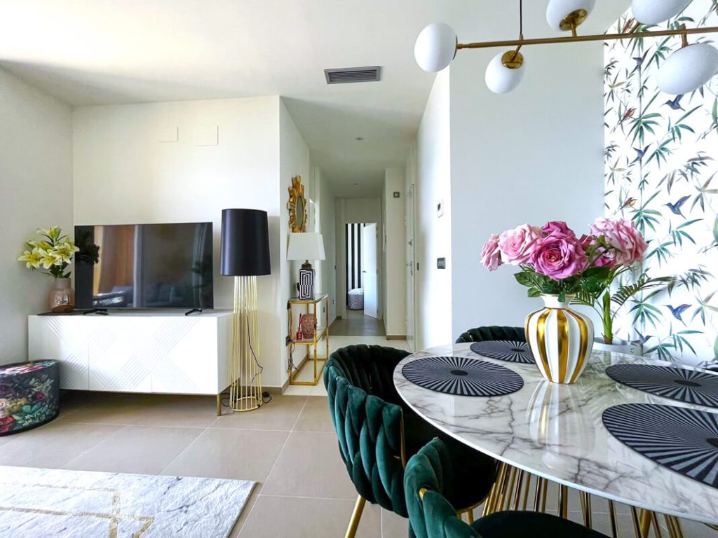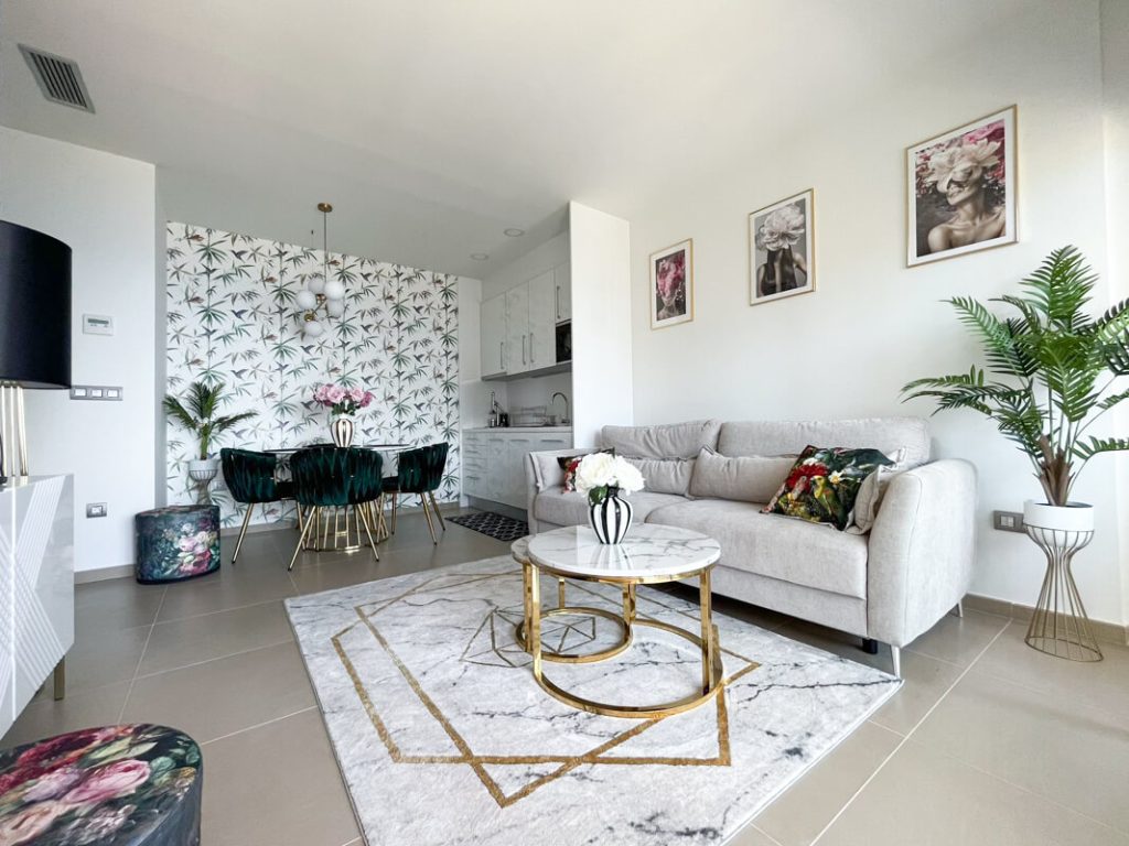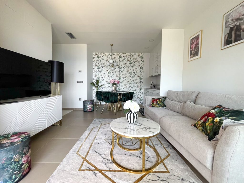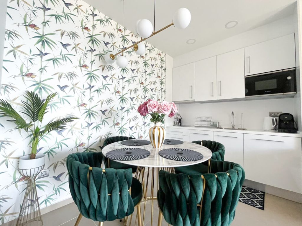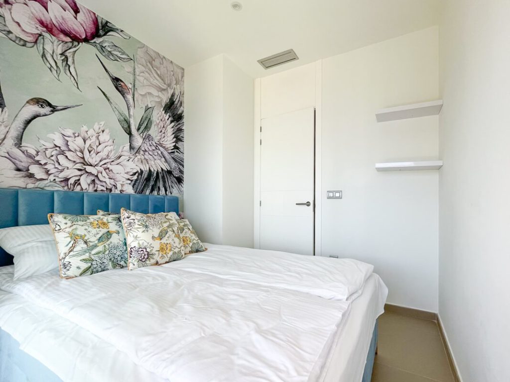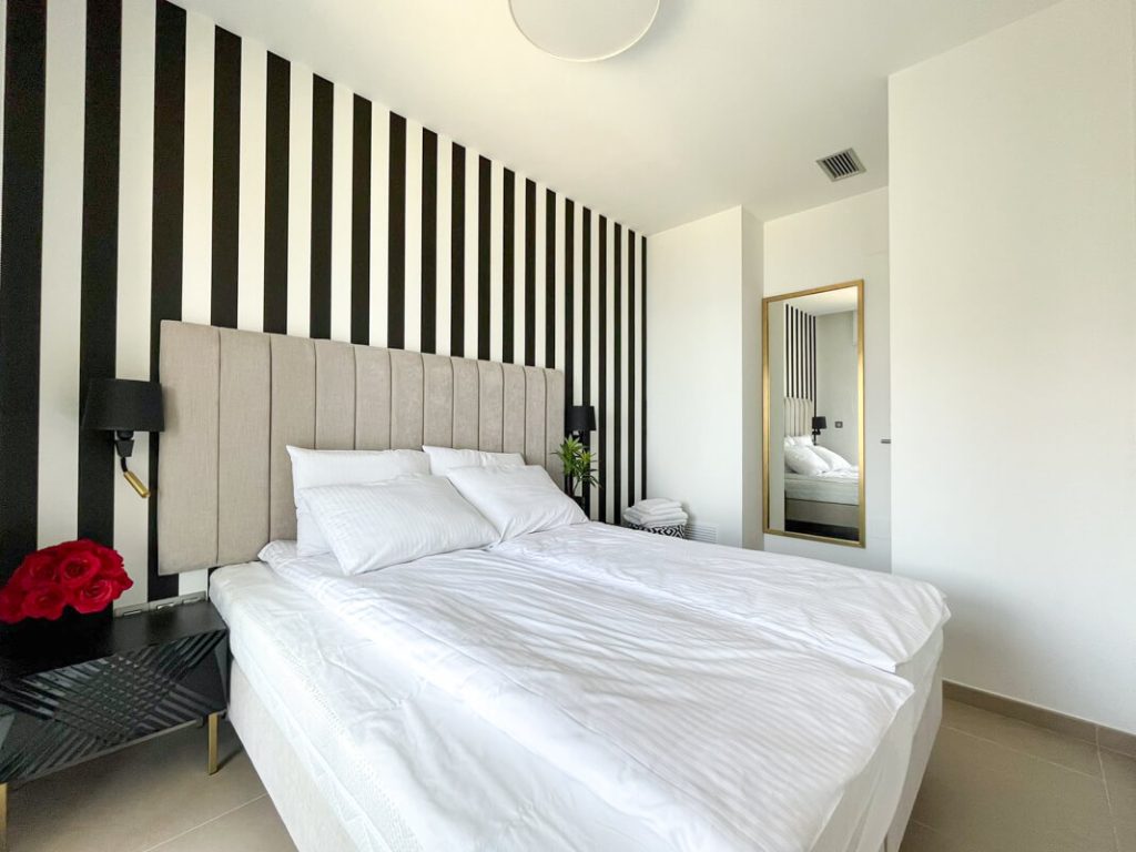 Elegancki apartament o wysokim standardzie, oferujący dwie sypialnie. Jedna sypialnia posiada duże, wygodne łóżko, idealne na relaks po dniu pełnym wrażeń. Druga posiada dwa pojedyncze łóżka. Nowoczesny salon, wyposażony w wygodny zestaw wypoczynkowy i telewizor, stanowi doskonałe miejsce na wieczorny odpoczynek lub spotkanie z bliskimi. W pełni wyposażona kuchnia, zawierająca najnowsze sprzęty, umożliwia przygotowanie własnych posiłków w komfortowych warunkach.