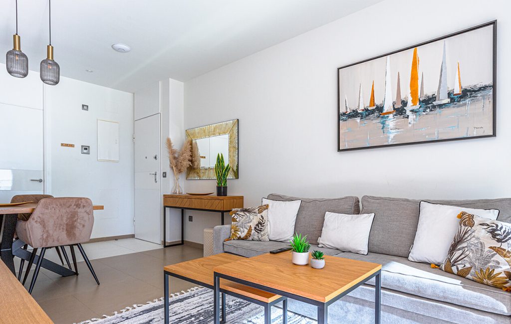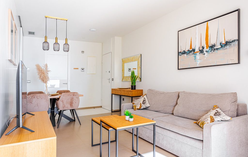Elegancki apartament z dwoma sypialniami, nowoczesnym salonem, dwoma łazienkami i w pełni wyposażoną kuchnią.